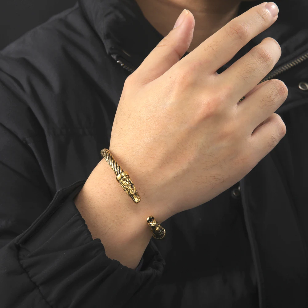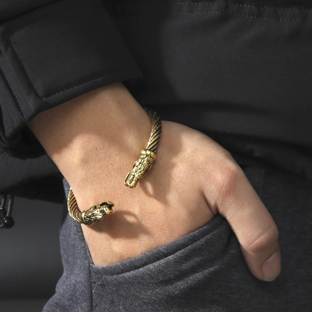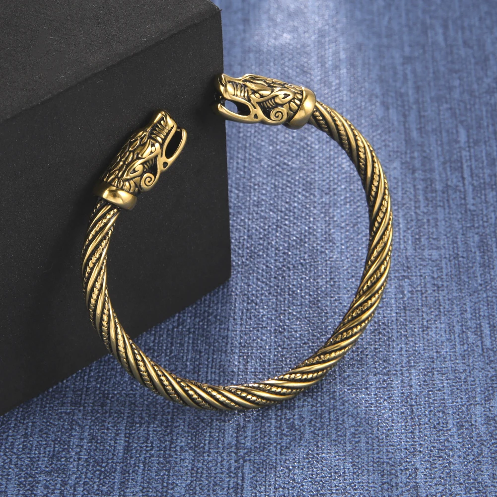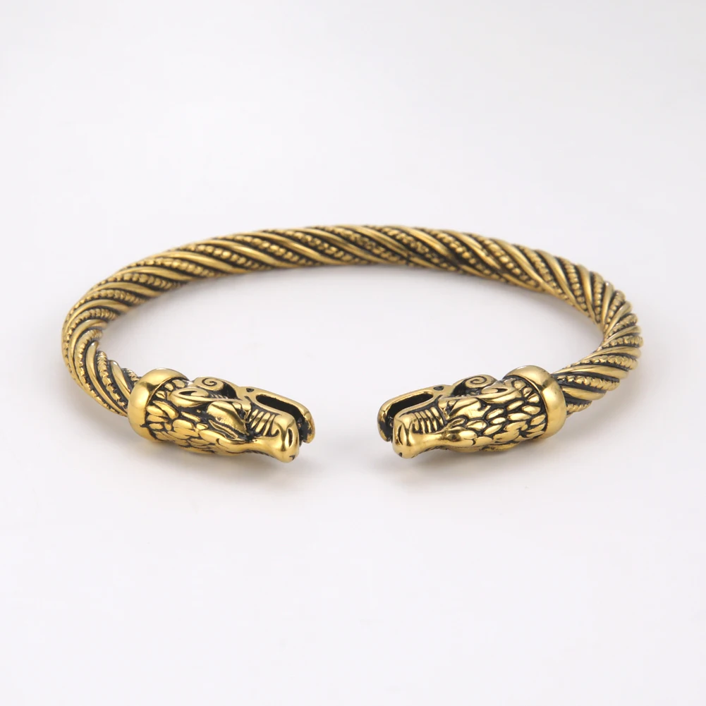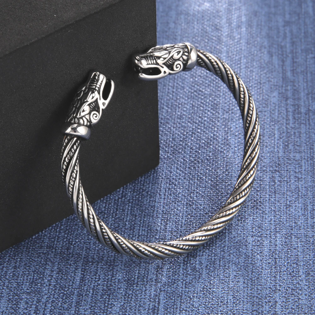 VIKING BANGLE Norse wolf not only embodies destructive power but also independence, loyalty, wildness, and family-orientation. This norse wolf heads bangle, featuring two wolf heads at both ends. Wolf’s heads represent protection, wisdom, and his welcome. |